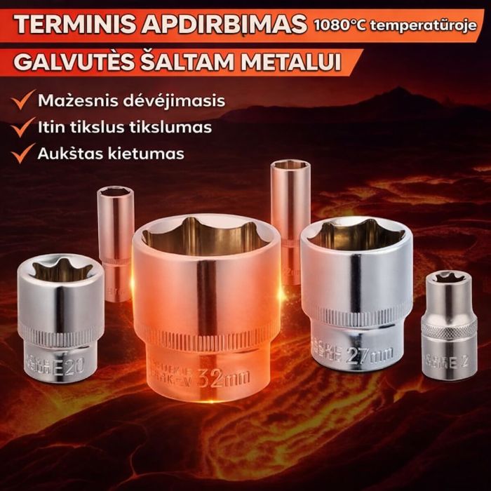 Profesionalus 108 dalių rinkinys iš chromo-vanadžio plieno, skirtas dirbtuvėms, automobiliams ir namų darbams: sudėtyje yra galvutės (standartinės, gilios ir E-Torx 4–32 mm), 72 dantų rakteliai, prailginimai, lankstūs jungiamieji elementai ir įdėklai, suderinami su 1/4” galvutėmis, 3/8” ir 1/2”