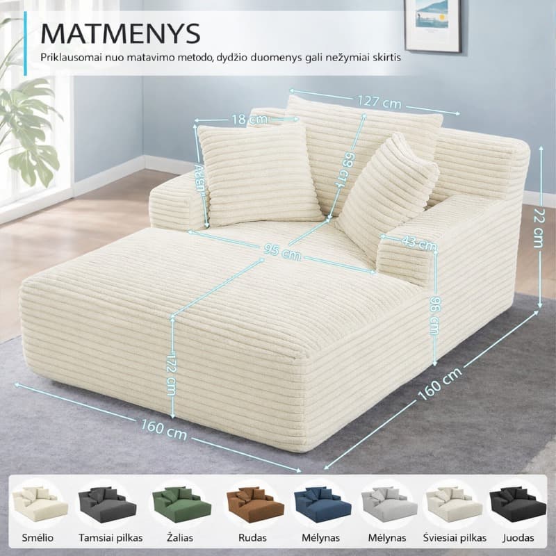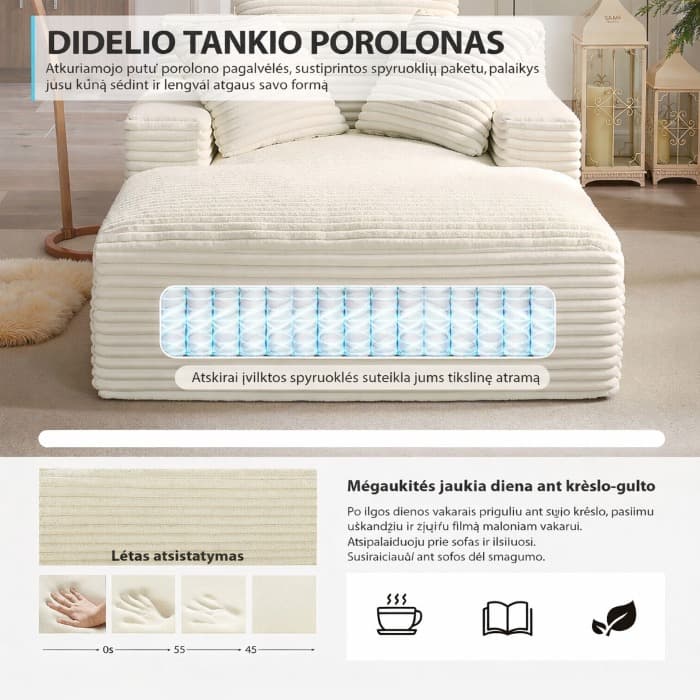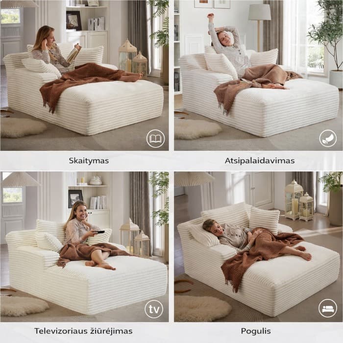 Sukurtas prisitaikyti prie kiekvienos jūsų dienos akimirkos, šis baldas tampa idealia vieta ramiam skaitymui, atsipalaidavimui po ilgos dienos, televizoriaus žiūrėjimui visiškame patogume ar atgaivinančiam poguliui. Plati ir jauki forma natūraliai palaiko kūną, leidžia lengvai keisti padėtį neprarandant komforto.