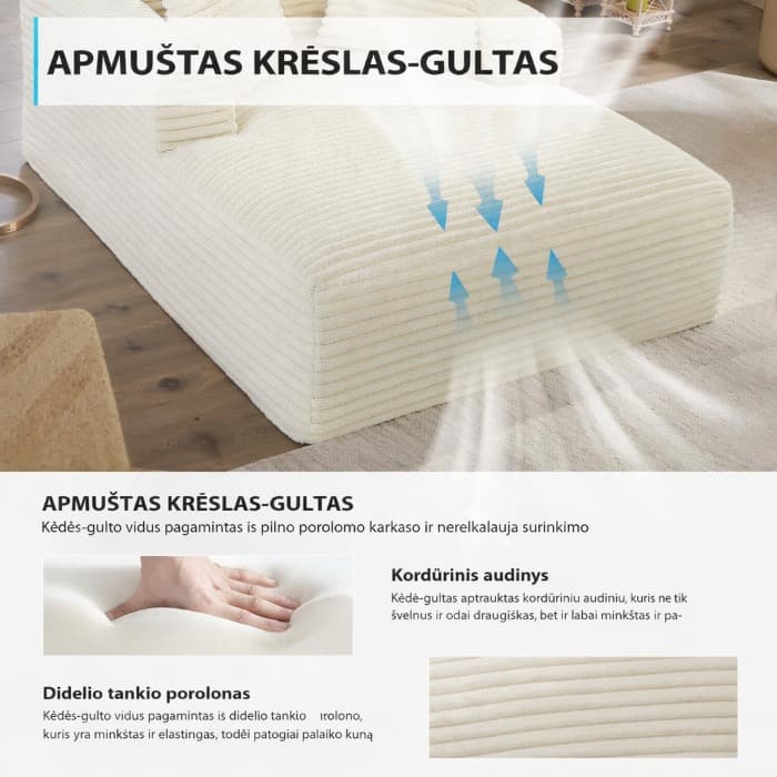 Puikiai tinka skaitymui, filmų žiūrėjimui ar atpalaiduojančiai pertraukai – elegantiško dizaino ir pažangių sprendimų derinys, kuris taps pagrindiniu modernaus interjero akcentu.