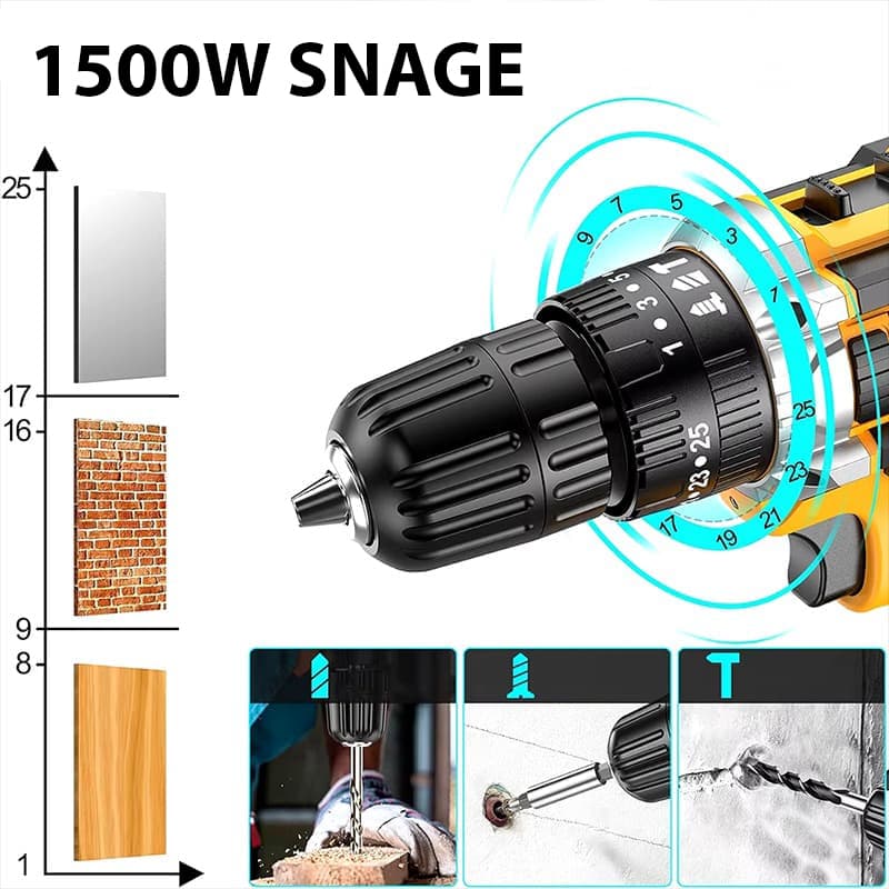 Bušilica 3-u-1: bušilica, odvijač i udarna bušilica. U paketu su nastavci za drvo, beton i željezo, nastavci za vijke, nasadni ključevi, imbus ključevi, dvije baterije i brzi punjač. 1500 W bešumni motor pogodan za sve vrste materijala, težak samo 1 kg za naporno ne naporno korištenje.